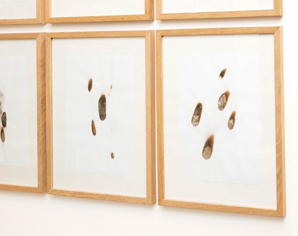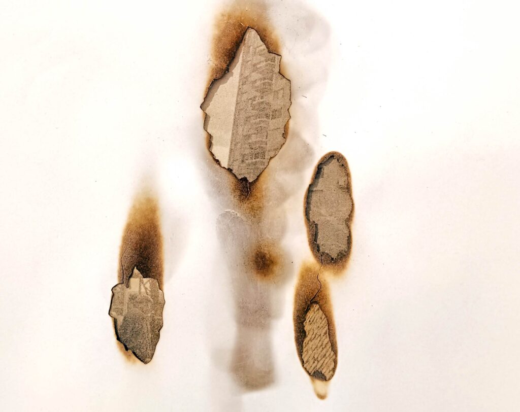 EXPANDED ECHOES CONSTELLATIONS ARCHIVES (details) – Archive images, newspapers, and burnt paper (various sizes) FIRE — The Boghossian Foundation Collection – Villa Empain, Brussels, 2025