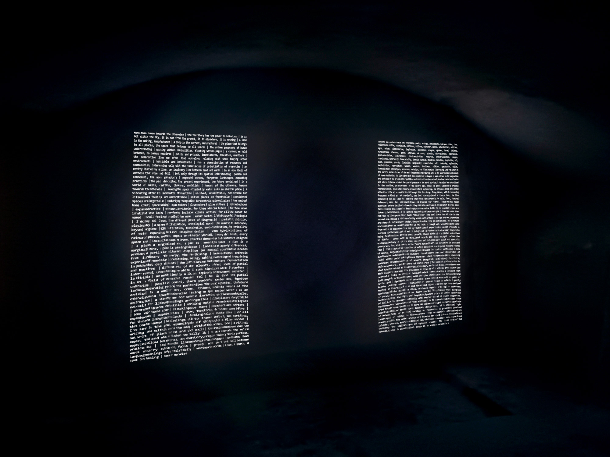 EXPANDED ECHOES | CURTAINS (Installed view): Single-channel video essay installation – 9’ 23’’, Florida, Genoa, 2025.